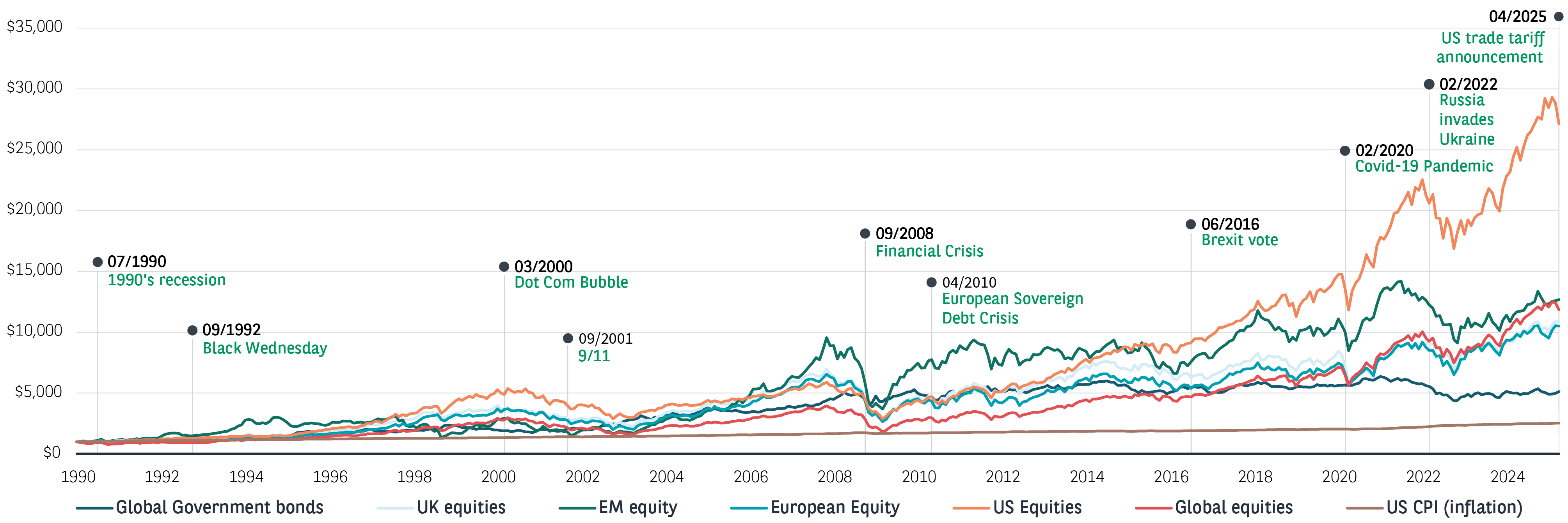 Source : Morningstar, data 31 December 1989 to 30 June 2025. US dollars. Rebased to 1000. Past performance does not predict future returns.